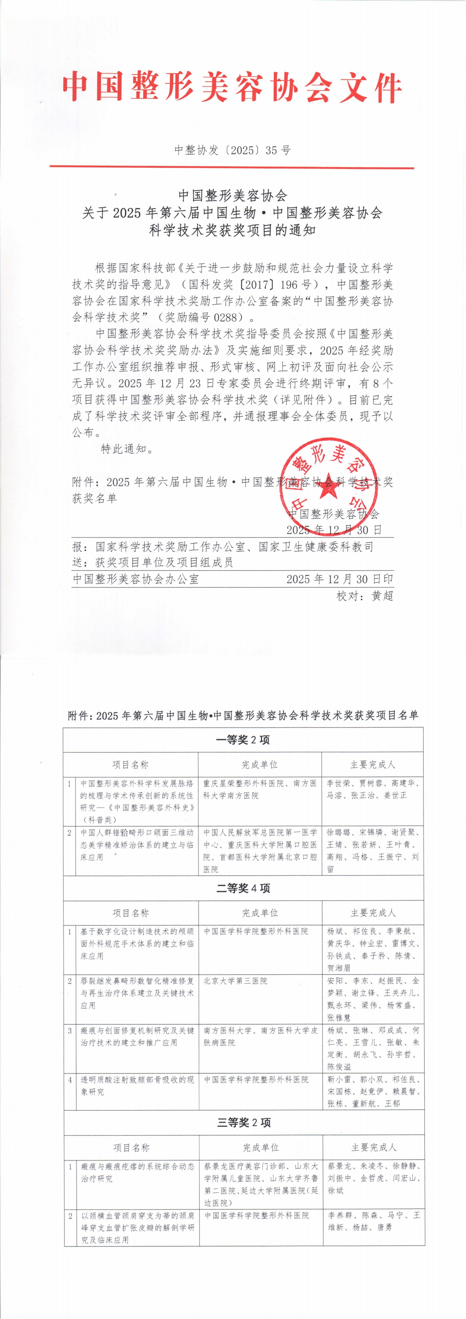 中国整形美容协会关于2025年第六届中国生物·中国整形美容协会科学技术奖获奖项目的通知